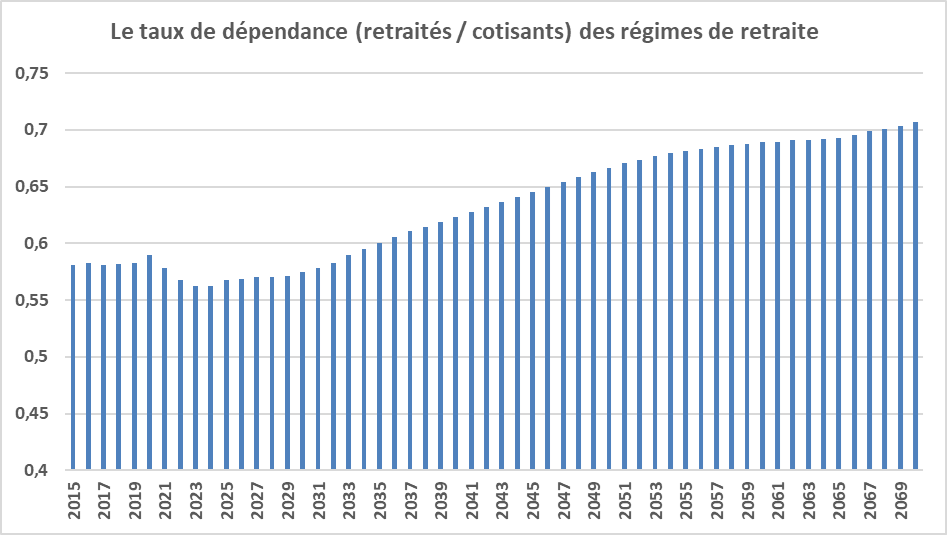 De 2024 à 2070, le taux de dépendance augmenterait de 27 % tandis que le taux de remplacement moyen diminuerait de 17 %. A taux de cotisation inchangé, on peut donc s’attendre à une dégradation de l’équilibre financier des régimes de retraite.