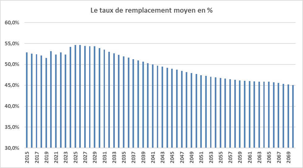 Le taux de remplacement moyen dépend surtout des modalités réglementaires de calcul des pensions en fonction des rémunérations d’activité au moment du départ en retraite, d’une part, et de l’écart entre le taux de revalorisation annuelle des pensions et le taux de croissance annuel des revenus d’activité, d’autre part.