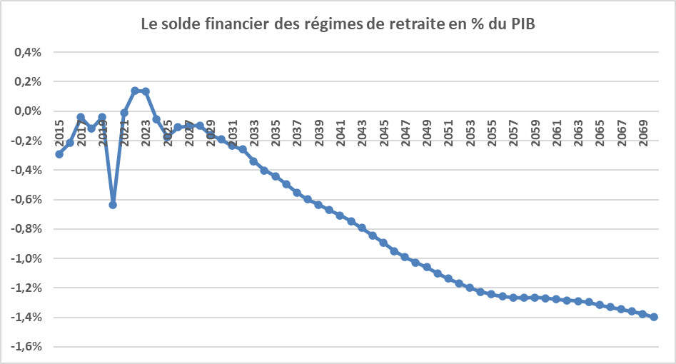 Le déficit des régimes de retraite serait à peu près stabilisé à 0,2 % du PIB jusqu’à 2030 puis augmenterait pour atteindre 0,7 % du PIB en 2040, 1,1 % en 2050 et 1,4 % en 2070.