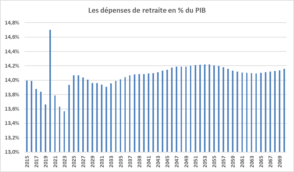 Dans le scénario central du COR, les dépenses de retraite représenteraient 13,9 % du PIB en 2024. Elles augmenteraient légèrement en 2025 et 2026 du fait des mesures sociales de compensation décidées dans le cadre de la réforme de 2023 pour revenir à 13,9 % du PIB en 2032. Elles augmenteraient ensuite légèrement pour atteindre 14,2 % du PIB en 2070.