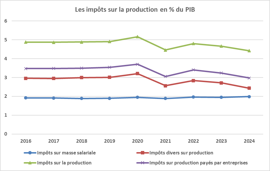 Dans ces conditions, le produit des impôts sur la production est passé de 108,8 Md€ en 2016 à 129,0 Md€ en 2024 (+ 20,2 Md€), soit une croissance de 2,2 % par an, et de 4,9 à 4,4 % du PIB.