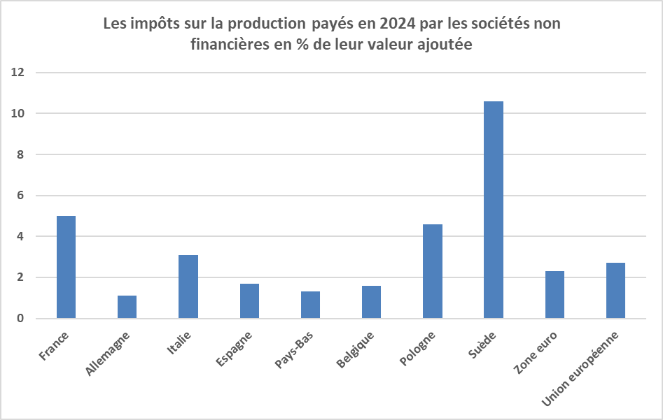 Les impôts sur la production sont en partie payés par les ménages. Ceux qui sont payés par les sociétés (donc hors entreprises individuelles) ont représenté 2,9 % du PIB en France en 2024 alors que la moyenne était de 1,4 % pour la zone euro et 1,6 % pour l’Union européenne et qu’ils représentaient seulement 0,7 % du PIB en Allemagne. La France est restée au deuxième rang derrière la Suède (6,9 % du PIB).