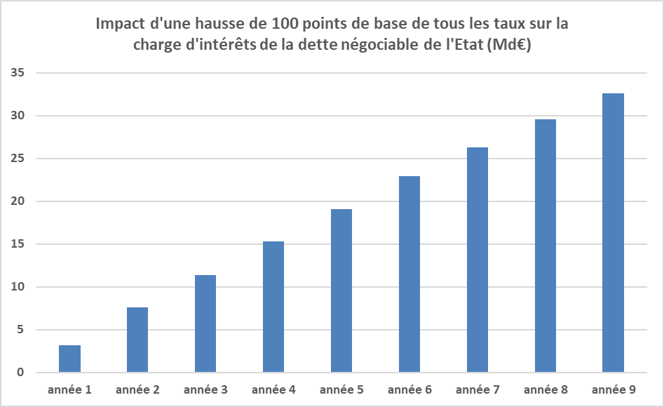 Au total, une hausse au 1er janvier de 100 points de base de tous les taux d’intérêts, c’est-à-dire sur toute la « courbe des taux » qui donne à chaque instant le taux d’intérêt en fonction de la durée de l’emprunt, entraînerait une augmentation de la charge d’intérêt de la seule dette négociable de l’Etat (78 % de la dette publique), en comptabilité nationale, de 3,2 Md€ la première année, de 7,6 Md€ la deuxième, de 19,1 Md€ la cinquième et de 32,6 Md€ la neuvième[1]. Une baisse des taux a des effets symétriques.