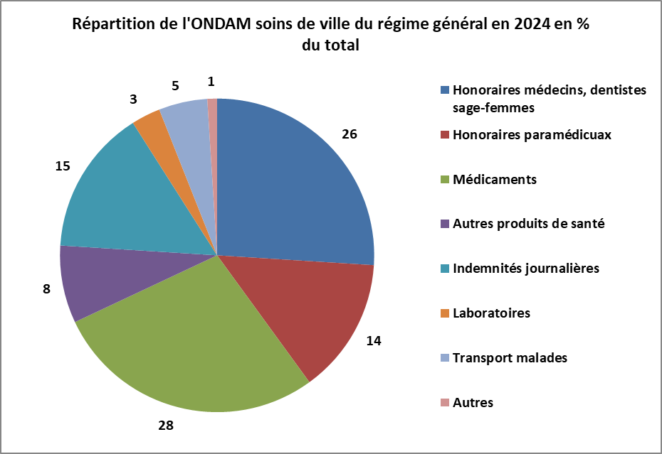 L’ONDAM (256 Md€ en 2024) est ventilé en : « soins de ville » (110 Md€) ; établissements de santé (106 Md€, dont 83 % pour les hôpitaux publics et 17 % pour les cliniques privées) ; établissements médico-sociaux (16 Md€ pour les personnes âgées et 15 Md€ pour les personnes handicapées) ; autres dépenses (10 Md€). La répartition des remboursements de soins de ville, pour le seul régime général, figure dans le graphique ci-joint.