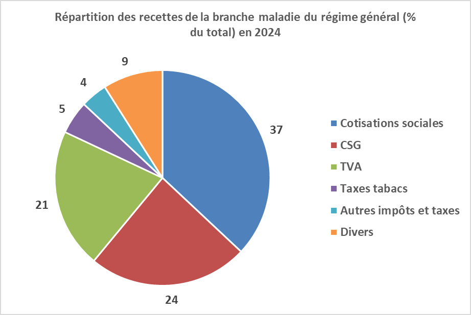 Le régime général représente désormais 98 % des produits et charges de l’ensemble des régimes obligatoires de base d’assurance maladie. Les cotisations sociales, en l’espèce à la charge des employeurs, ne représentent plus que 37 % des recettes de sa branche maladie (la CNAMTS). La CSG et la TVA en représentent respectivement 23 et 21 %.