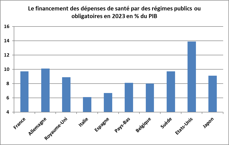 Le graphique suivant montre le pourcentage du PIB que représentent les dépenses de santé financées par des régimes publics ou privés et obligatoires (sécurité sociale et régimes obligatoires, Etat, collectivités locales). La France se situe derrière l’Allemagne et les Etats-Unis à égalité avec la Suède. S’agissant des Etats-Unis, la part des régimes obligatoires (souvent privés) est passé de 7,9 % du PIB en 2013 à 13,8 % en 2014 du fait de la réforme Obama.