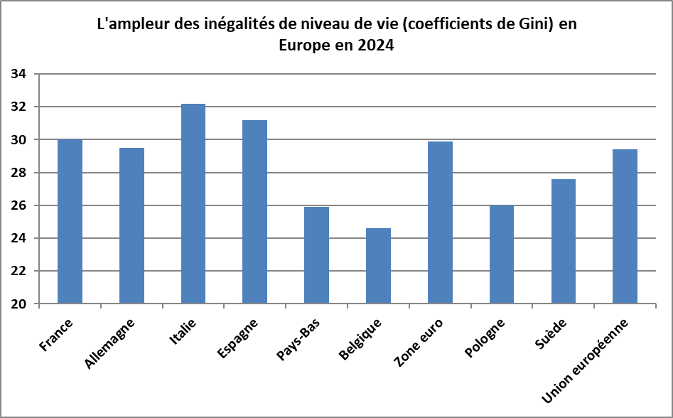 Le coefficient de Gini des niveaux de vie est estimé à 30,0 en France en 2024 par Eurostat[2], ce qui est supérieur à la moyenne de l’Union européenne (29,4) et quasiment égal à celle de la zone euro (29,9). La France est donc moins égalitaire que la moyenne de l’Union européenne. La France est le 17ème pays le plus égalitaire de l’Union. Parmi les principaux pays européens, la Belgique, la Pologne et les Pays-Bas ont un coefficient nettement plus faible alors que ceux de l’Italie et de l’Espagne sont plus élevés.