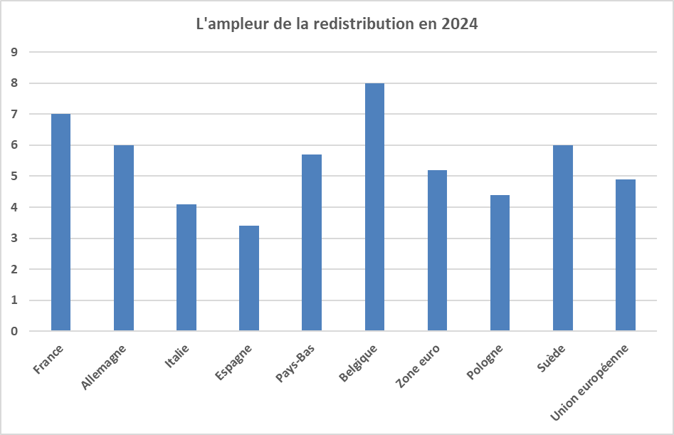 Le graphique suivant montre que l’ampleur de la redistribution en France en 2024 est supérieure à la moyenne européenne et à celle de la plupart des grands pays européens à l’exception de la Belgique. Elle est particulièrement faible en Italie, en Espagne et en Pologne.