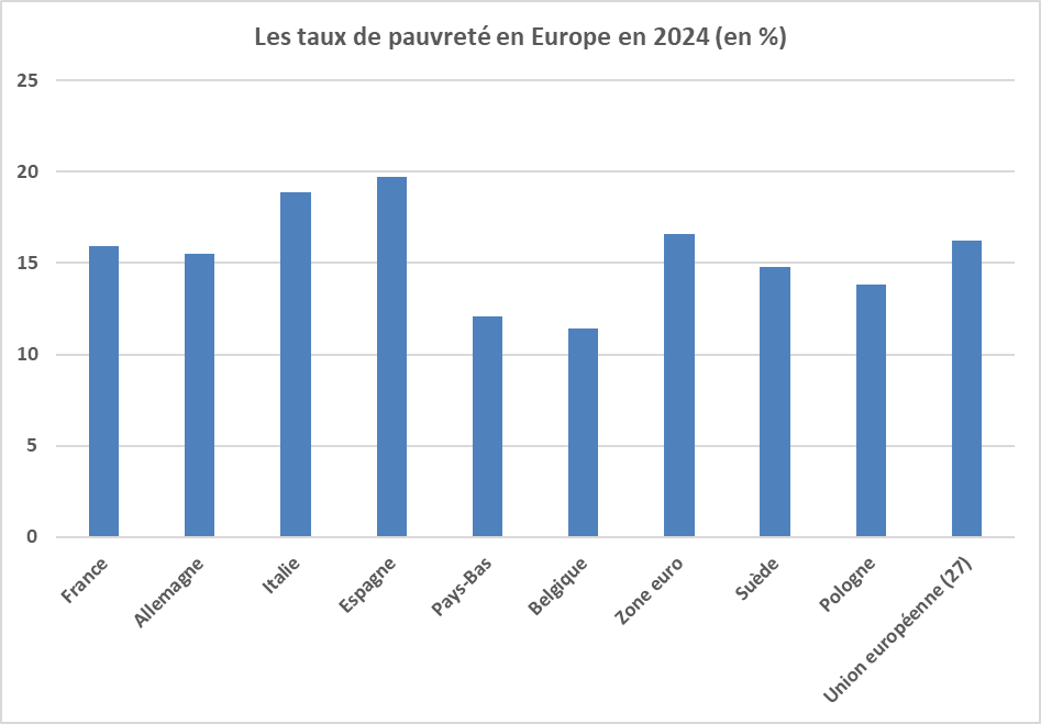 Selon Eurostat, le taux de pauvreté en 2024 est en France de 15,9 %, contre une moyenne de 16,6 % dans la zone euro et 16,2 % dans l’Union européenne. Il est nettement plus élevé en Italie et en Espagne. Il est nettement plus faible aux Pays-Bas et en Belgique.
