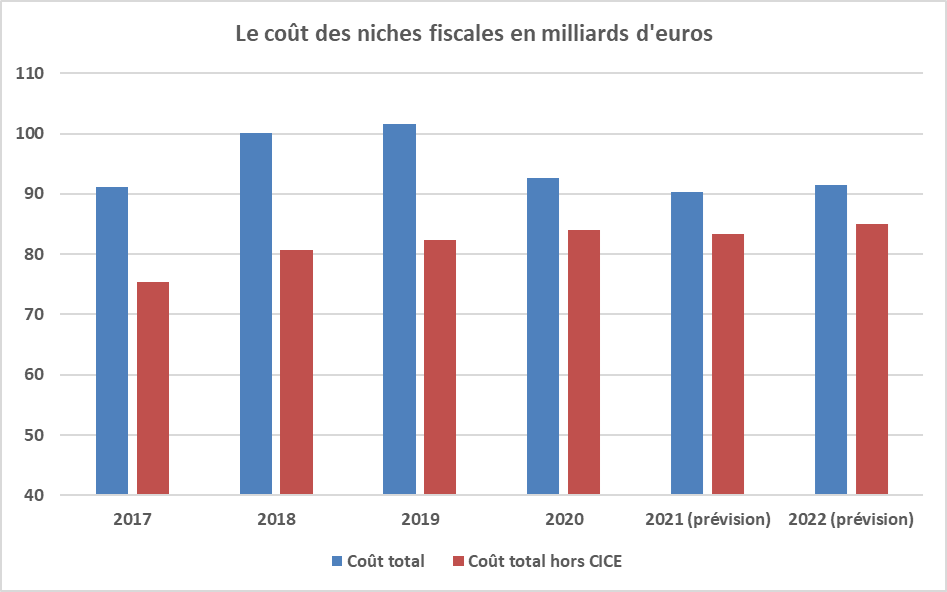En 2017, le coût total des niches fiscales (au format du PLF 2022) s’élevait à 91,1 Md€ et leur coût hors CICE à 75,4 Md€.