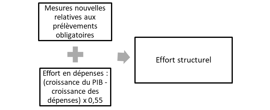 L’effort structurel est exprimé en points de PIB et comprend deux volets : un effort de hausse des prélèvements obligatoires et un effort de maîtrise des dépenses publiques.