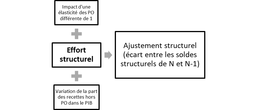 L’effort structurel réalisé l’année N n’est pas égal à l’écart entre le solde structurel en N et le solde structurel en N-1, écart qui est appelé « ajustement structurel ». La différence entre l’effort et l’ajustement structurels a, pour l’essentiel, deux origines.