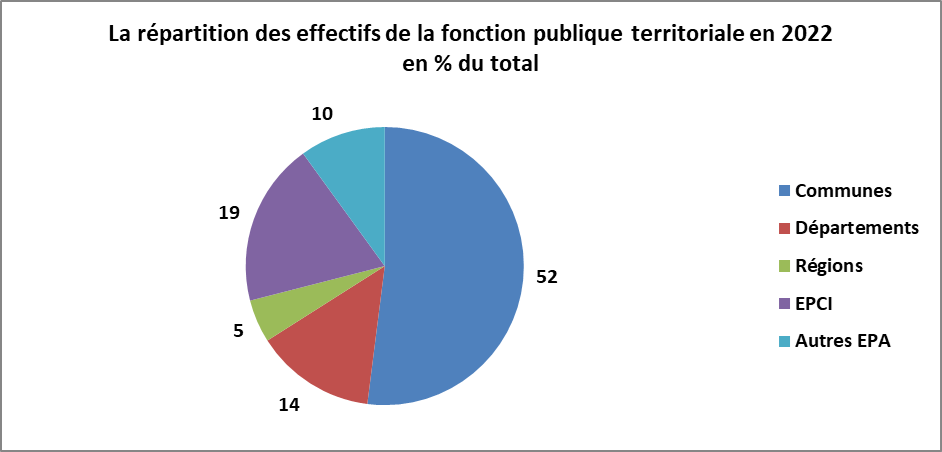 Le graphique ci-dessous montre la répartition des effectifs de la fonction publique territoriale entre les communes, les départements, les régions les établissements publics de coopération intercommunale (EPCI) et les autres établissements publics locaux à caractère administratif (EPA). Plus de la moitié des agents sont employés par les communes.