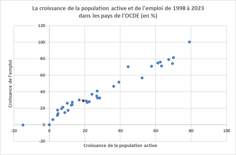 Le graphique suivant met en relation les taux de croissance de la population active et de l’emploi dans les pays de l’OCDE de 1998 à 2023. Il montre que croissance de l’emploi est d’autant plus forte que la population active est dynamique à long terme.