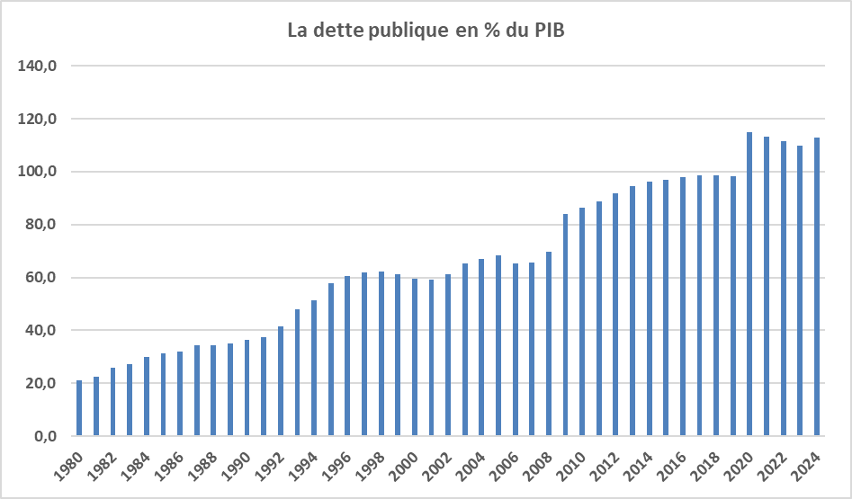 En 2024, la dette publique a augmenté de 6,5 % en euros (203 Md€). La croissance du PIB ayant été moins forte (3,5 %), elle est revenue à 113,0 % du PIB. La hausse de la dette en euros est supérieure au montant du déficit public (170 Md€) car certaines administrations ont accru leur trésorerie, notamment la caisse nationale qui regroupe les Urssaf.