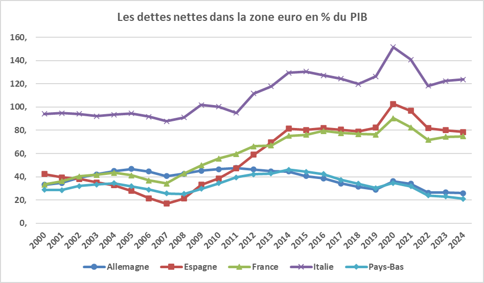 A la fin de 2024, les dettes publiques de l’Allemagne et des Pays-Bas restaient proches ou au-dessous de 60 % du PIB alors que celle de l’Italie s’était accrue pour se situer près de 140 % du PIB. Celles de la France et de l’Espagne avaient aussi augmenté et se trouvaient entre 100 et 115 % du PIB. Après avoir réduit son endettement, la Belgique se situait entre ces deux derniers pays.