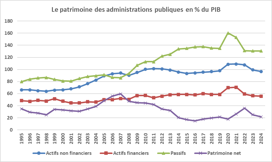 La valeur nette du patrimoine des administrations publiques, différence entre le total de leurs actifs et le total de leurs passifs, est de 633 Md€, soit 21,7 % du PIB, à la fin de 2024. Elle a diminué de 78 Md€ par rapport à son montant à la fin de 2023, passant ainsi de 25,1 % du PIB à 21,7 %.