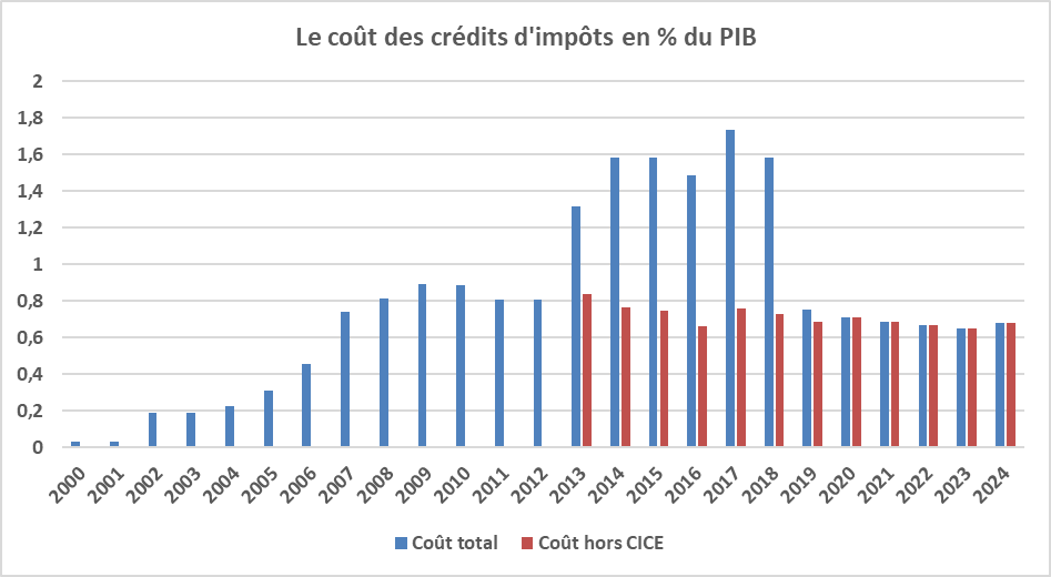 Les crédits d’impôts hors CICE sont repartis à la hausse en 2017, notamment en raison de la généralisation du crédit d’impôt pour emplois à domicile. Ils ont ainsi coûté l’équivalent de 0,8 point de PIB en 2018 en comptabilité nationale. Ensuite, le coût du CICE est devenu résiduel et celui des autres crédits d’impôts est resté à peu près stable en pourcentage du PIB (0,7 % du PIB, soit 19,8 Md€, en 2024).