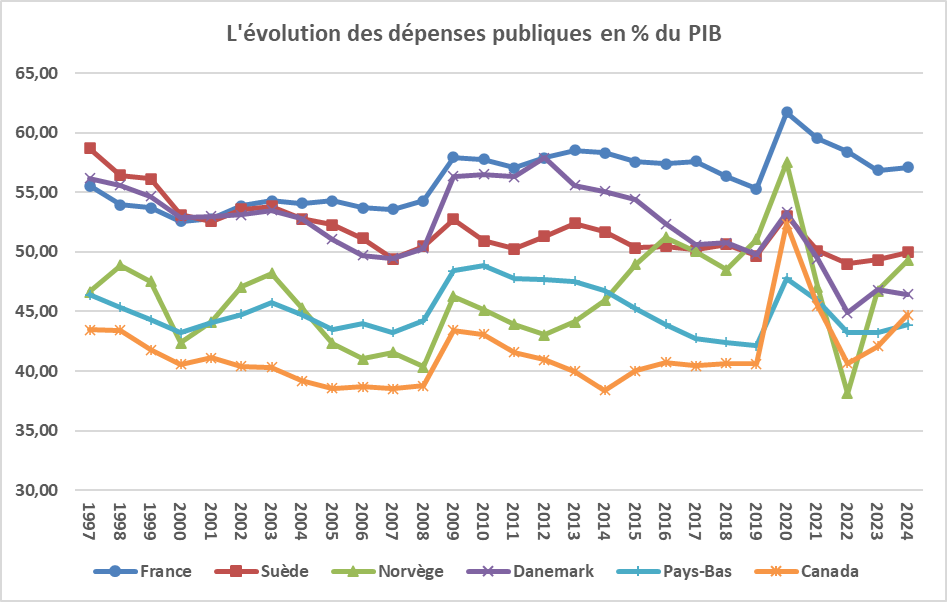 Les pays scandinaves, en particulier, ont fortement réduit leurs dépenses publiques du milieu des années 1990 jusqu’à la crise financière de 2008-2009. Ils les ont ensuite accrues, sauf la Suède, mais elles se trouvaient nettement au-dessous de celles de la France en 2024 alors qu’elles étaient au-dessus (Suède et Danemark) à la fin des années 1990.