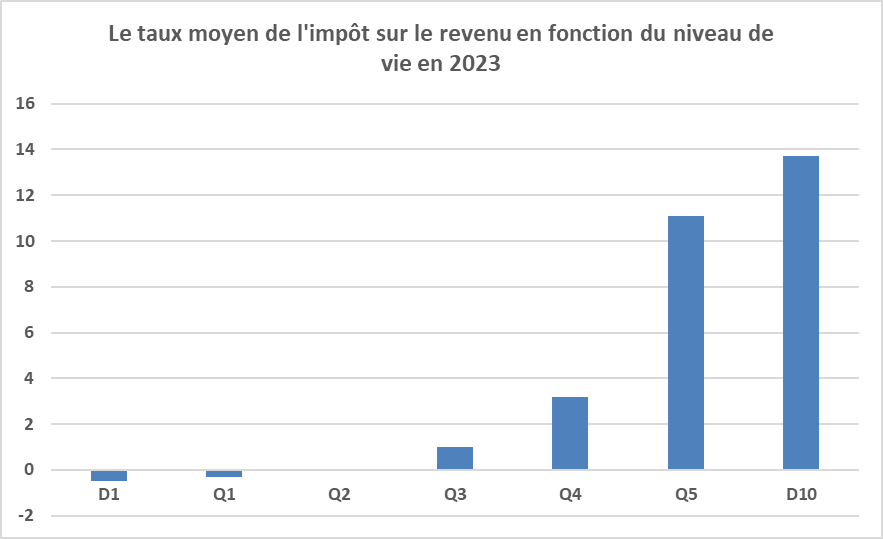 Ce taux moyen est négatif pour les ménages du premier et du deuxième quintile du fait des crédits d’impôts. Il est ensuite très progressif, passant de 1 % pour le troisième quintile dans lequel se trouvent beaucoup de ménages non imposés à 3% pour le quatrième quintile et 11 % pour le dernier quintile, dont le taux moyen est tiré vers le haut par le dernier décile (14 %).